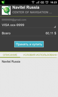 Для пользователей Навител на Android появилась возможность покупки лицензии на программу или на дополнительный комплект карт Навител сразу с навигационного устройства: через Android Market, при наличии возможности выхода в интернет.