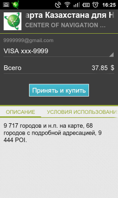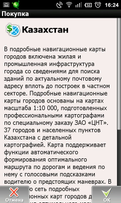 Для покупки лицензии на программу при запуске пробной версии, нажмите кнопку «Купить» после запуска программы, и выберите программу с необходимым комплектом карт. После чего вы будете переадресованы на страничку Android Market, где сможете найти подробное описание продукта, цену на него, и совершить покупку.