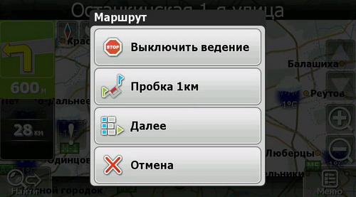 При движении по проложенному маршруту, желая выбрать альтернативный путь или при необходимости объезда (например, перекрытая дорога), пользователь может задать принудительную перепрокладку маршрута, нажав кнопку «Пробка 1км» в дополнительном меню, появляющемся при клике на поле маршрута. Активность сервиса «Навител.Пробки» и соединение с интернетом — не требуются.