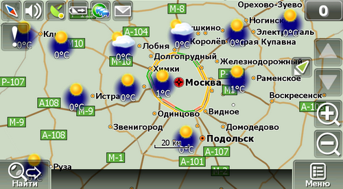 Для того, чтобы узнать погоду в близлежащих населенных пунктах, либо в точке назначения маршрута, больше нет необходимости прогружать меню Страницы — Погода в Навител Навигатор! Теперь погода в любом городе мира может отображаться непосредственно на карте Навител! Достаточно лишь активировать опцию в Меню — Настройки — Online сервисы — Погода.