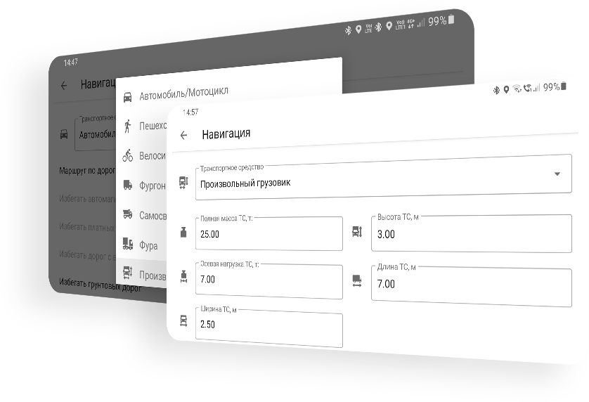 Предустановленная на NAVITEL DN505 MAGNETIC программа Навител Навигатор предлагает расширенный набор настроек для навигации большегрузного транспорта. Выберите в настройках тип грузового транспорта или создайте свое транспортное средство, добавив его параметры: длину, ширину, высоту, максимальную разрешенную и фактическую массу, осевую нагрузку и т.д., и программа будет строить маршруты с учетом дорожных ограничений для данного вида транспорта, позволив беспрепятственно проехать до точки назначения.