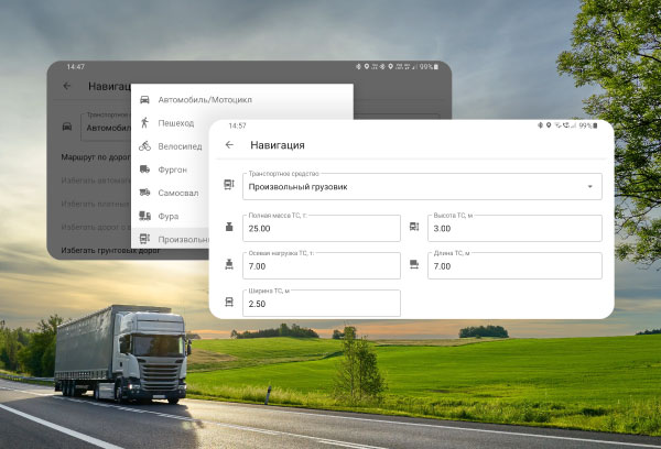 Предустановленная на NAVITEL N400 программа Навител Навигатор предлагает расширенный набор настроек для навигации большегрузного транспорта. Выберите в настройках тип грузового транспорта или создайте свое транспортное средство, добавив его параметры: длину, ширину, высоту, максимальную разрешенную и фактическую массу, осевую нагрузку и т.д., и программа будет строить маршруты с учетом дорожных ограничений для данного вида транспорта, позволив беспрепятственно проехать до точки назначения.