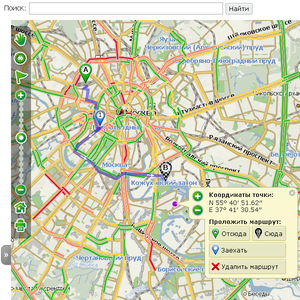 Пользователь онлайн-карты может проложить маршрут с любым количеством промежуточных точек с учетом данных о пробках по территории всей России, а также других стран. Выберите на карте точки старта и финиша с помощью правой кнопки мыши, при необходимости — задайте промежуточные точки маршрута.